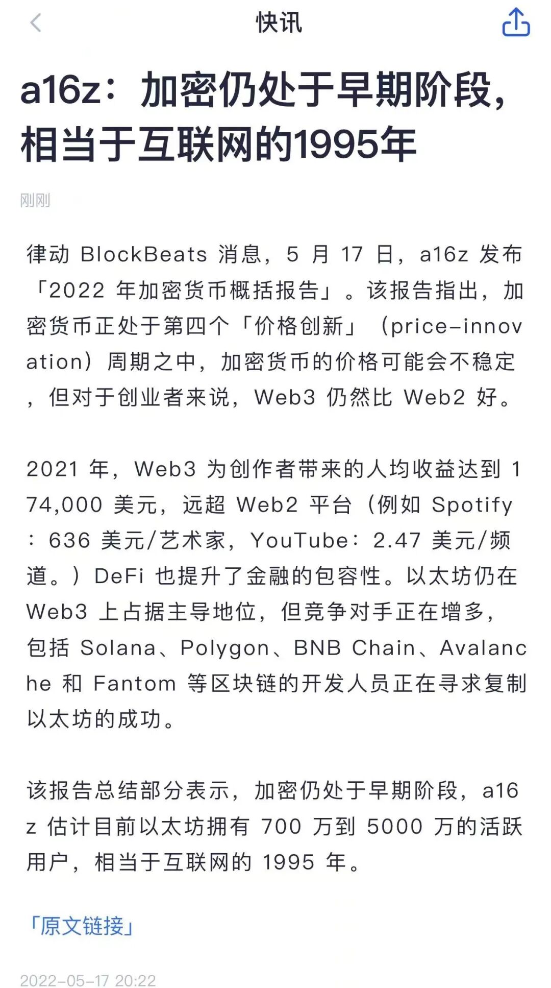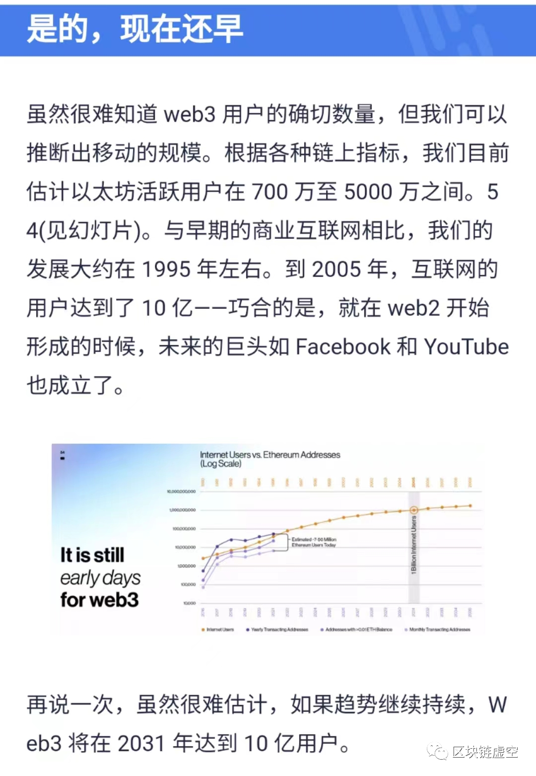 另外,昨天看到最新的A16Z加密行业分析报告(完整报告有兴趣的可以加微信获取),A16Z认为目前Web3还在早期,相当于1995年的互联网,未来20年有很大发展红利。如果趋势继续持续,Web3.0将在2031年达到10亿用户。