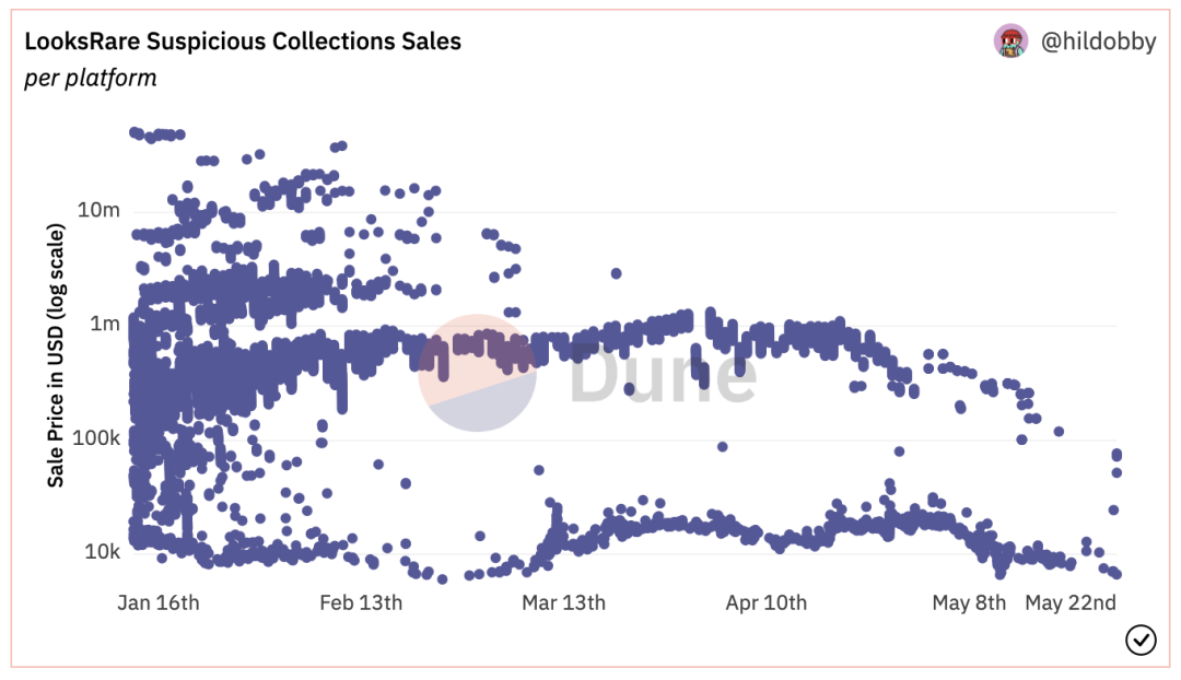 以 LooksRare 为例,刷量交易者(Washtraders)是平台最大的内部收入创造者(Implicit Revenue Generator)。他们给平台支付了大量的交易手续费(ETH)得到了LOOKS 并卖掉,用这种套利交易的方式持续获利。这更像一种 Token Sale 驱动的融资收入,而不是业务驱动带来的收入。