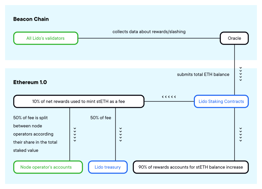 以 Lido 为例,一个普通用户进行以太坊质押通常面临很长的锁仓时间,但如果在 Lido 平台质押,就可以得到 stETH 并且可以立即取走,同时还享受 Staking 收益。Lido 协议的成本是发行与 Staking ETH 1:1 承兑的 stETH ,收入则是从用户的 ETH Staking 中抽取10%利差。