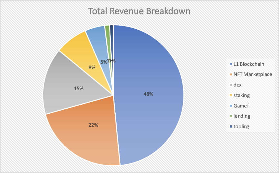 我们可以看到,如果用 Protocol Revenue 来衡量协议的盈利能力,排行榜与通过Total Revenue衡量完全不同。榜单中,Defi 的占比直线下降,而L1公链,NFT交易平台,Gamefi项目仍保持不变。