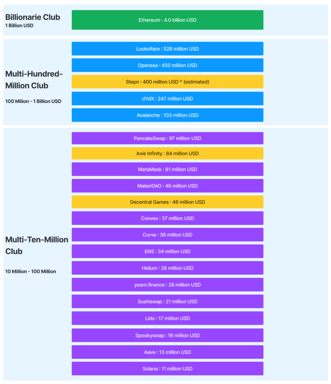 第一档: Ethereum 和 Opensea ,Ethereum 的半年总收入为 4.6 billion USD,在榜单中遥遥领先;Opensea 的半年总收入约为 1.8 billion USD,也是一个疯狂的现金奶牛;