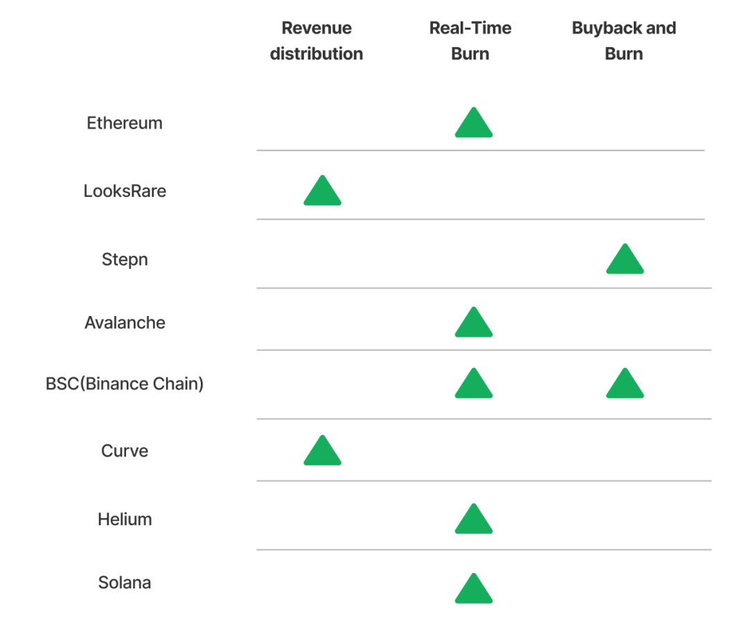 在上述具备Protocol Revenue的协议中,我们进行了调整(特此说明:我们增加了BSC,其文档披露了详细的实时销毁和回购计划,但未被 Token Terminal 收录),总共发现有8个协议满足“Token可以捕获收入价值”的条件。