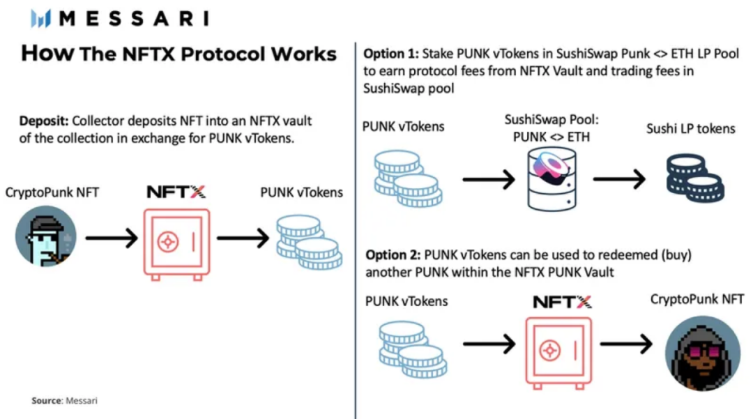 NFTX 是专注于地板款 NFT 赛道的项目,让使用者可以将地板款的 NFT 存入项目金库,并换成等值的 vToken (ERC20),让其他人可以投资部分的地板款 NFT。对于中高价位的同系列 NFT,由于价值定位困难,且难以进行等值 vToken 的计算,NFTX 决定舍弃这块市场,专注于做可以直接对标的 NFT 项目。