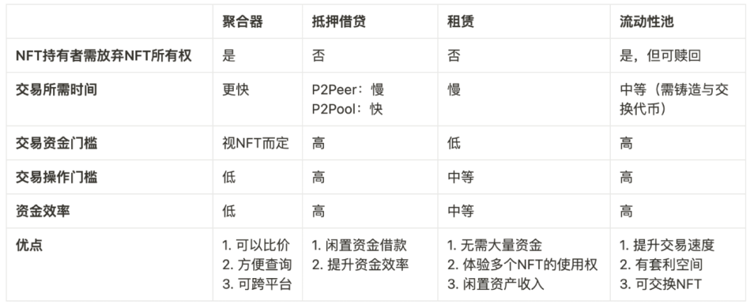 资金利用率低的问题,可以通过借贷、租赁的方式解决。市场目前有 P2P 借贷协议 NFTfi.com、P2Pool 借贷协议 DROPS与租赁协议 Doubles。