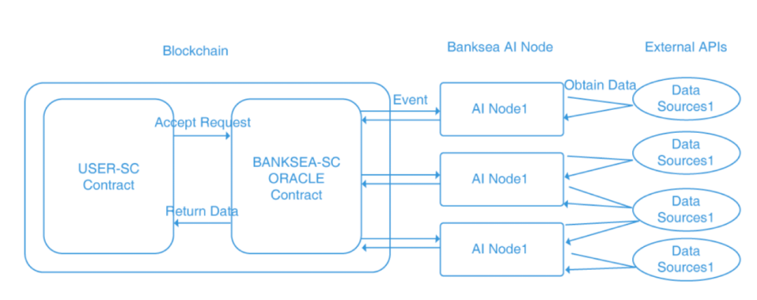 Banksea 的预言机架构分为三部分:节点数据提供方、AI 计算节点与终端使用者。当使用方提出报价需求时,Banksea AI Node 就会向外在节点申请资料,在拿到资料后通过自己的演算法计算并将价格与风险指数通报给 Banksea 的 SC,最后回报给使用者。