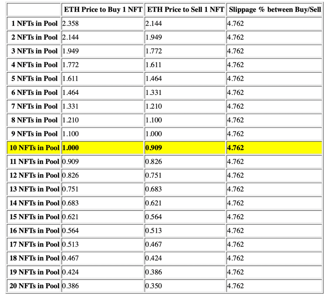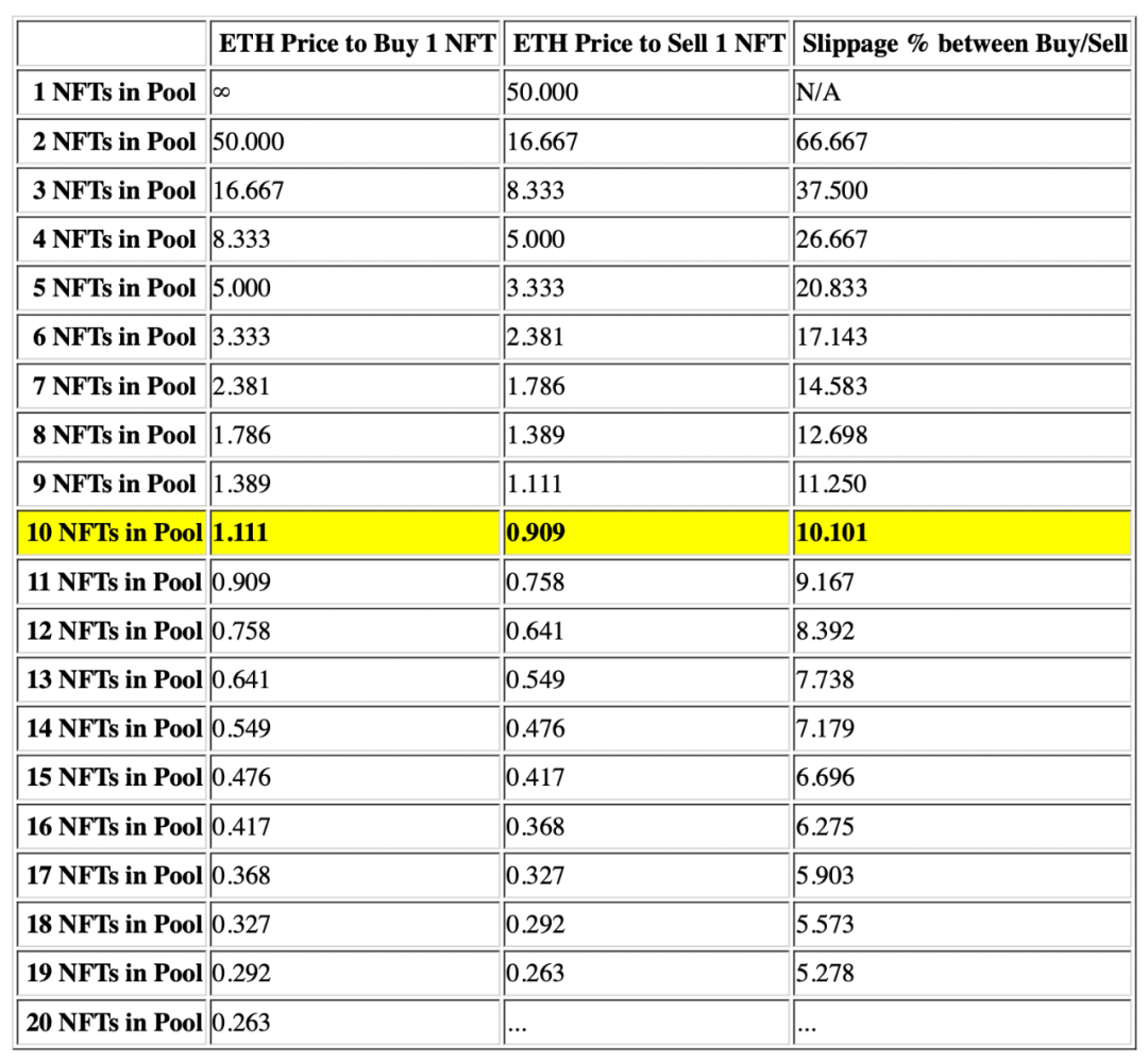 倘若以这两张试算表格来说,单纯使用 X*Y=K 买 5 张 NFT 需要花费平均 2 ETH,滑价固定模型仅需要支付平均 1.221 ETH。然而 sudoSwap 的风险是对于流动性池的 NFT 布局,如果 NFT 的流动性太少或设置流动性分布不均交换的成本会变高。又因 NFT 每一张价格的独特性,使用这种 AMM 模型会有几率抹平 NFT 的多样性,且 NFT 的多样性会导致愿意投入的 NFT 流动性过少,面对这样的矛盾,市场的采用度势必很难提高。