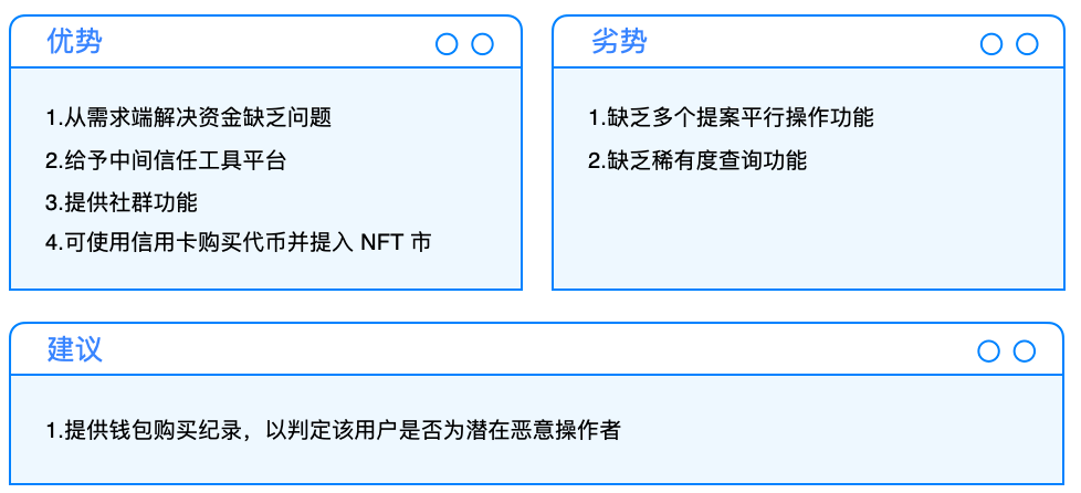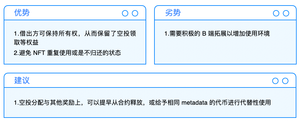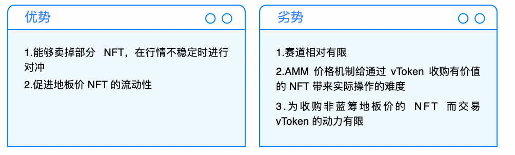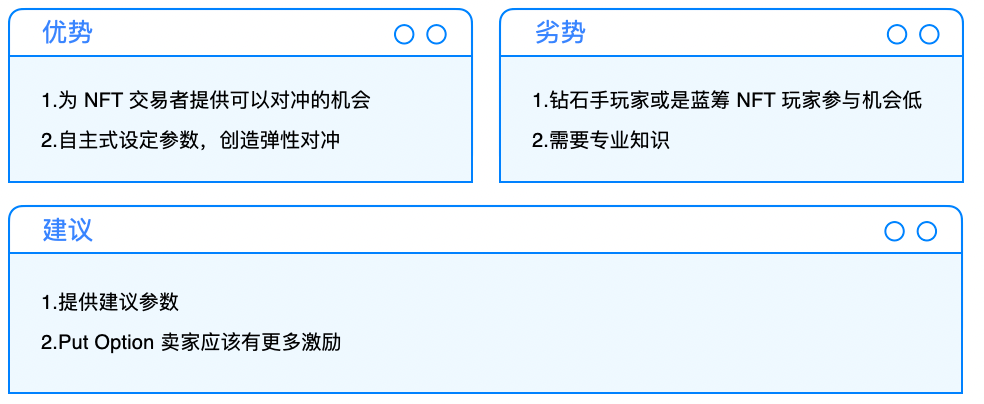 然而,这种模式会导致大部分钻石手的 NFT 用户不敢使用,纵然对冲掉了价格波动,但却造成 NFT(Underlying Assets)的流失。在一般金融商品中便于在未来时间点内进行回补,但 NFT 的特殊性反而会造成应该行权但却因为顾虑 NFT 流失的问题而不行权的状态,反而有违项目设计本意。因此,使用情境上应该多为炒作的 NFT,才有机会在这个市场中流通。