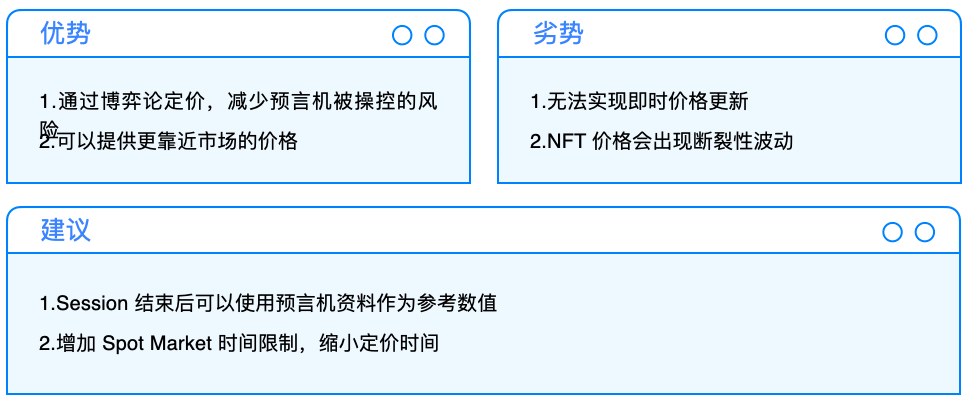 在这个两个机制的建立底下,交易者会有诱因去促使 NFT 的价格尽力趋近于有流动性的定价,同时去使用这个 AMM 机制进行套利。再加上因为交易者不知道池子拥有人会使用哪一种方式关闭池子,交易者很难通过压低池中认定将赚取价值,因为如此一来池子拥有人就会选择退出赎回 NFT,反而拿到更少收益。这种类似赛局的做法,在交易者充足的前提下能够使得 P2Pool 的价格推向市场的价值认同点。