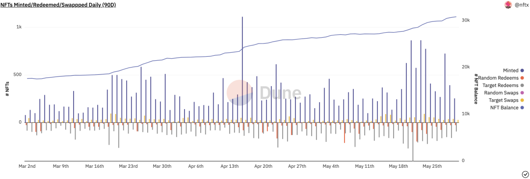 需求端的增长速度很快,一天之内最高有约 1100 个 NFT 被铸造成 ERC20 的 vToken,5月内可以收取约 $1.2 million 的费用。