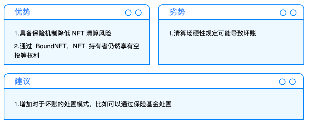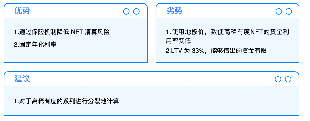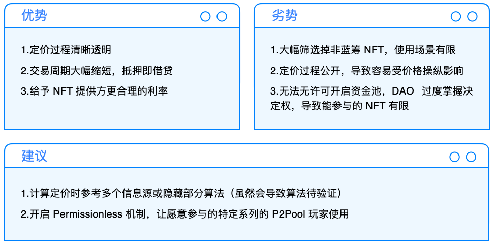P2Pool 模式虽然可以增进资金利用率,但常会因为预言机、定价模型或单边大行情出现导致仓位遭到清算而被迫进入拍卖场,倘若拍卖场又因为流动性问题而清算失败,则又会导致清算金分配的问题。按照目前的运行逻辑,P2Pool 模式需要对参与借贷的 NFT 进行严格筛选,因此受众相对有限。
