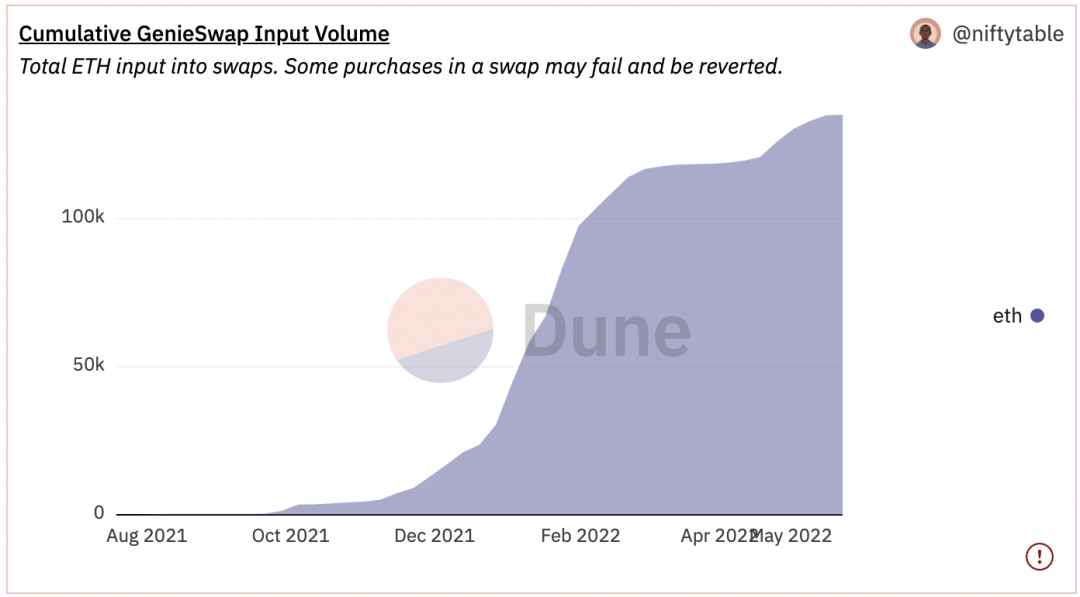 随着时间推移,更能节约 Gas Fee 的聚合器协议 gem.xyz 横空出世。在大幅度减少 Gas Fee 与更友善的 UI 设计下,Gem.xyz 快速将 Genie 的先发优势吞噬,并在 NFT 聚合战中获得大幅领先,目前每日使用量几乎是 Genie 的 5 倍 (Dune Analytics @sohwak, 2022),且配合上架分析与用任意 ERC20 代币支付手续费的设计,持续提升用户黏性。虽然 Genie 后续与 Looksrare 等陆续有其他合作出炉,但用户已经习惯了使用 Gem.xyz。