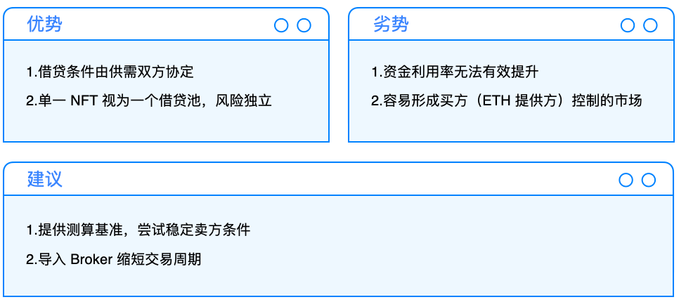 P2P 模式的劣势:NFT 的利用率较低,因为交易周期比较长,同时双方的共同决议价格不一定是 NFT 的内在价值,导致需要资金的 NFT 持有方可能会因为急需要钱,进而使用过于便宜的价格出售。在流动性与价格之前的取舍,反而让 P2P 的协议进入到买方(ETH 提供方)权力过大的市场。
