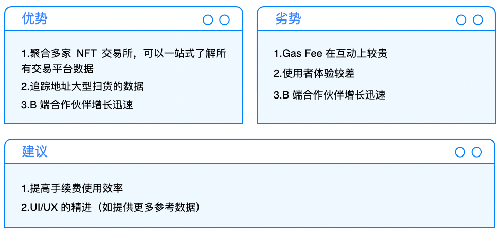 在NFT聚合赛道中,Gem.xyz 通过简单易懂的 UI 设计与大幅度 Gas Fee 减少的优势,让 Genie 目前难以在用户数和交易量上望其项背,而这个赛道的出现也让分崩离析的 NFT 市场有了大一统的交易环境,减少了使用者在购买 NFT 上的搜寻成本。