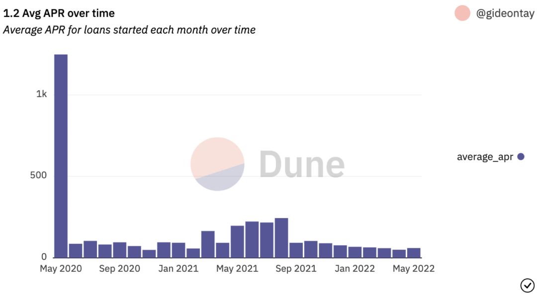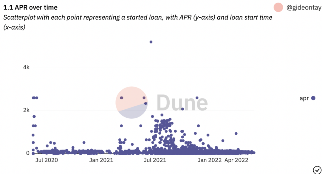 NFTfi.com 目前的 APR 分布约 30% 到 110%不等,2022 年 5 月平均年化收益为 60% 左右。