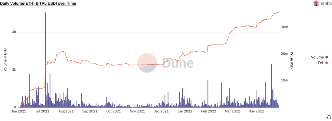 目前,NFTX 的日交易量达143 ETH,且约有 $36 million 的 TVL 维护整个协议的运行。