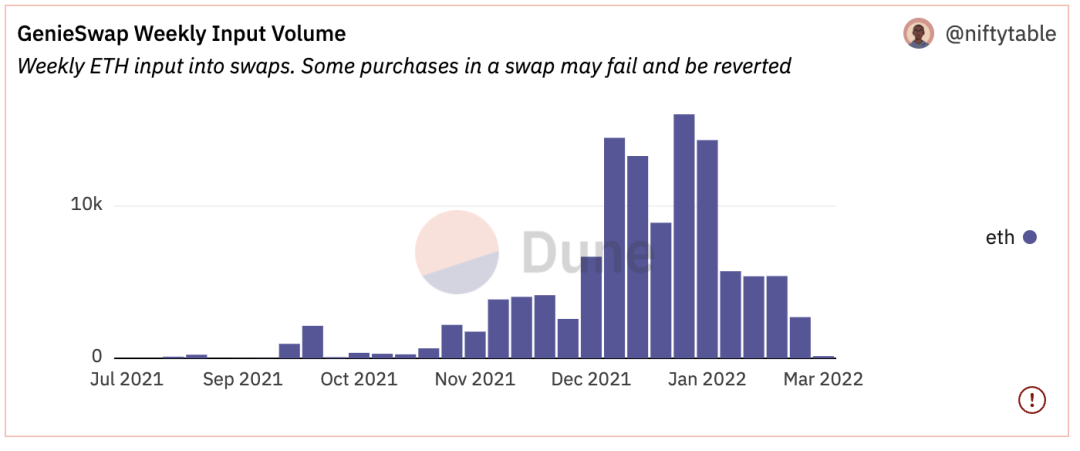NFT 市场的聚合赛道比较早出现的是 Genie,已接入 OpenSea, Rarible, NFTX, NFT20 等多家 NFT 市场,在上线初期获得很大的关注度,到目前为止累积了约 $270 million 的交易量,且周用户数最多达约 3600 人。