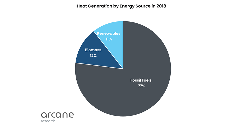 化石燃料是最常见的供热能源,约占能源结构的四分之三。剩下的四分之一基本平均分配在传统生物质能和现代可再生能源之间。