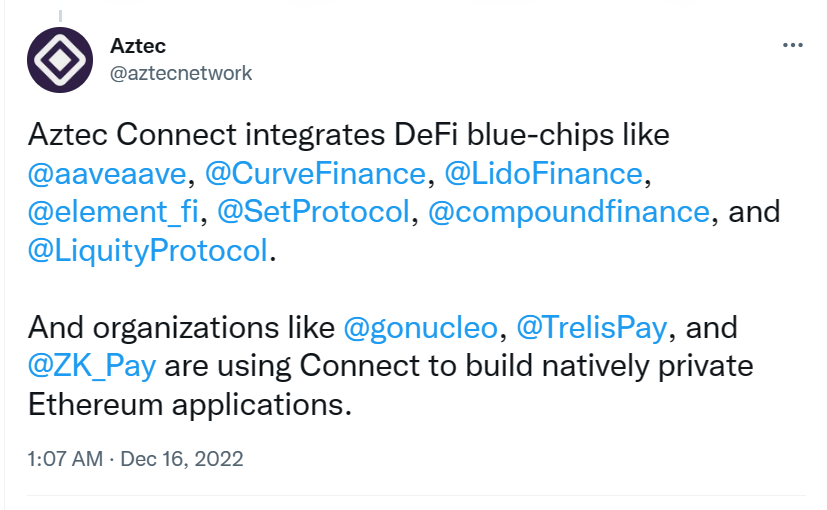Aztec 重点之一 Aztec Connect 在 7 月 7 日正式上线,这是一套连接以太坊 DeFi 协议和 Aztec 的 private rollup 工具,其能够在三部分(Layer 1 DeFi 协议、Aztec Connect SDK 和 Aztec Connect Bridge 合约)的帮助下支持隐私 DeFi。Aztec Connect 扩展了 Zk.money 的功能,增加了蓝筹 DeFi 合作伙伴的功能,它通过与其他 Zk.money 用户的批量交易来允许隐私访问以太坊主网上的协议,使以太坊项目较容易可地集成 Aztec。Aztec Connect 像 DeFi 的代理服务,允许任何人存入 Aztec 网络,与以太坊 DeFi 交互,并依赖于 Layer 1 的可信合约、流动性。当前 Aztec Connect 生态系统包含以太坊主流 DeFi 协议,包括 Aave、Curve、Lido、Compound 和 Liquity 等。