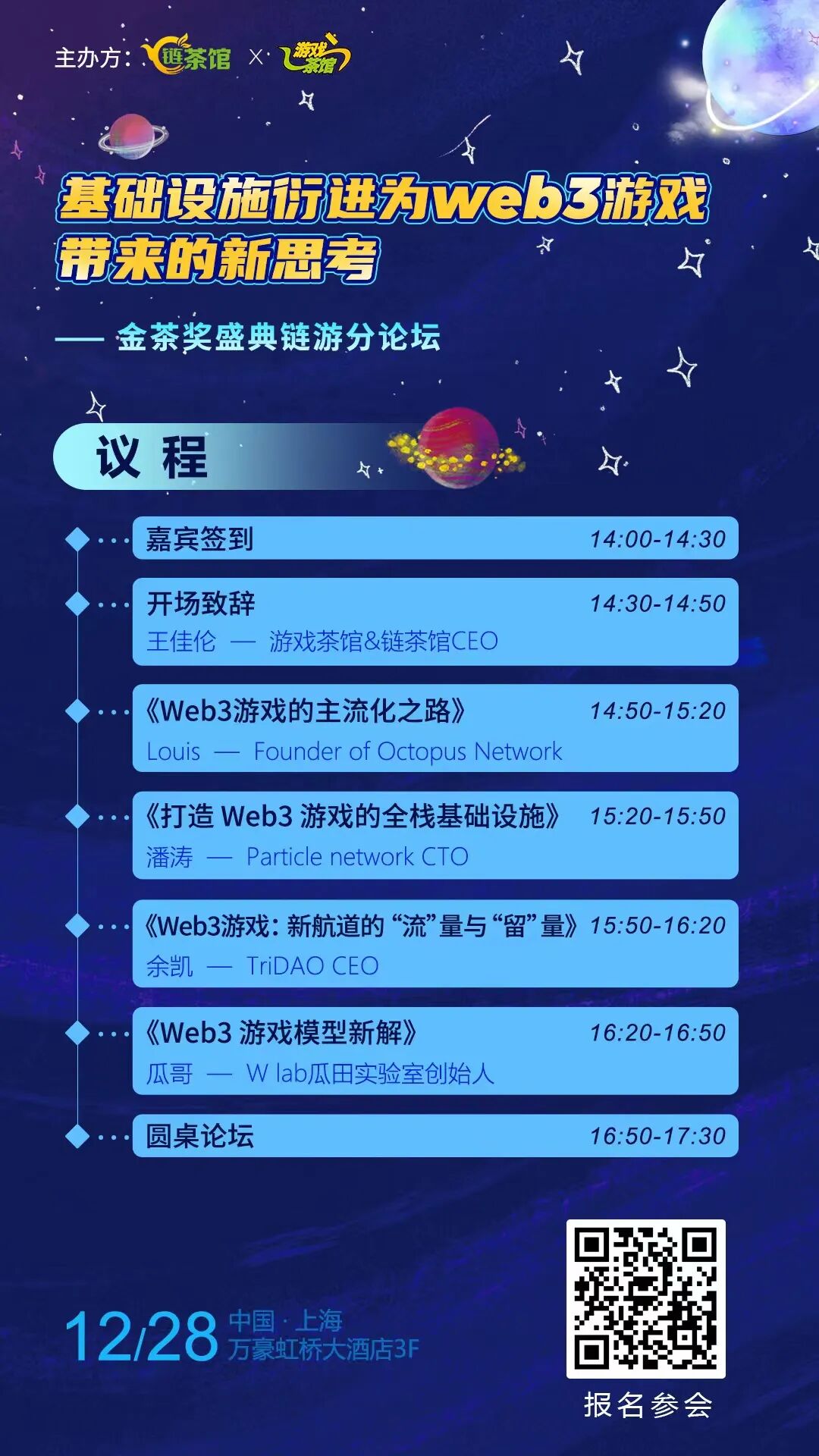 欢迎来到游戏茶馆和链茶馆主办的第十届金茶奖盛典(2022年12月28日周三在上海万豪虹桥大酒店举行),现场有「GameFi链游专场」沙龙,邀请多个区块链行业和游戏行业的大咖,参加主题分享以及圆桌论坛,拨开迷雾见未来!