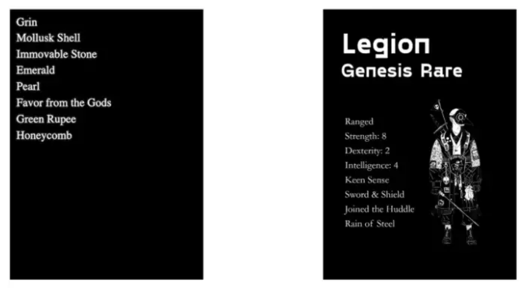 Loot是一个由8000个NFT构成的系列,NFT是8个短语组成的TXT文件,每个短语相当于一个随机生成的属性(如武器、胸甲、头甲、项链、戒指等),具有不同的稀有度。