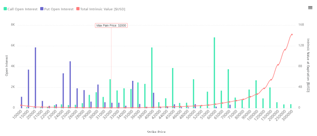 上图为比特币在各个行权价上的期权持仓量(来源:https://www.coinoptionstrack.com/),通过查看比特币在未来某个时间以及各个价位的看跌看涨期权持仓量,可以大致了解到对未来行情走向的一个大体预判。