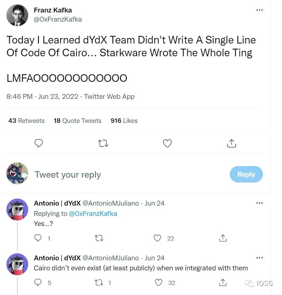 cairo和solidity是两种完全不同的编程语言,并且从逻辑上没有互通性(一个主要是写zk电路,一个是写智能合约,现状是为了吸引更多的开发者starkware搞了一个第三方compiler,可以帮助完成从solidity到cairo的编译),并且在当时基本上是starkware labs帮助dYdX完成了整个cairo代码的编写(cairo就是starkware自己研发的语言)。所以,从项目方的角度出发并没有多少对于这个语言乃至于生态的归属感。