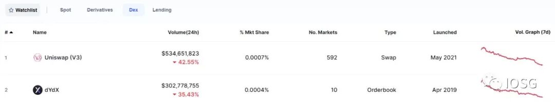 而去中心化交易市场上情况却不一样。现货与衍生品交易量的数据对比,以太坊上最大的长尾资产现货交易市场Uniswap V3却超过了dYdX/Perpetual protocol等主流衍生品交易协议。