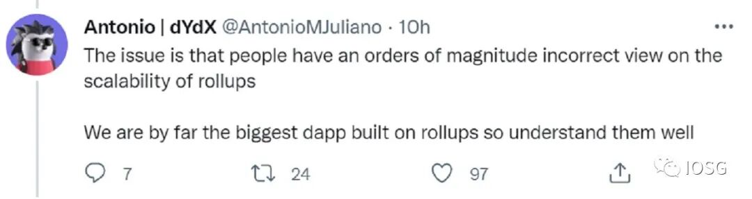 到了practice似乎事实也是如此 - dYdX founder暗示rollup的节点性能不够支撑其所需的tps(对于orderbook来说吞吐量至关重要)