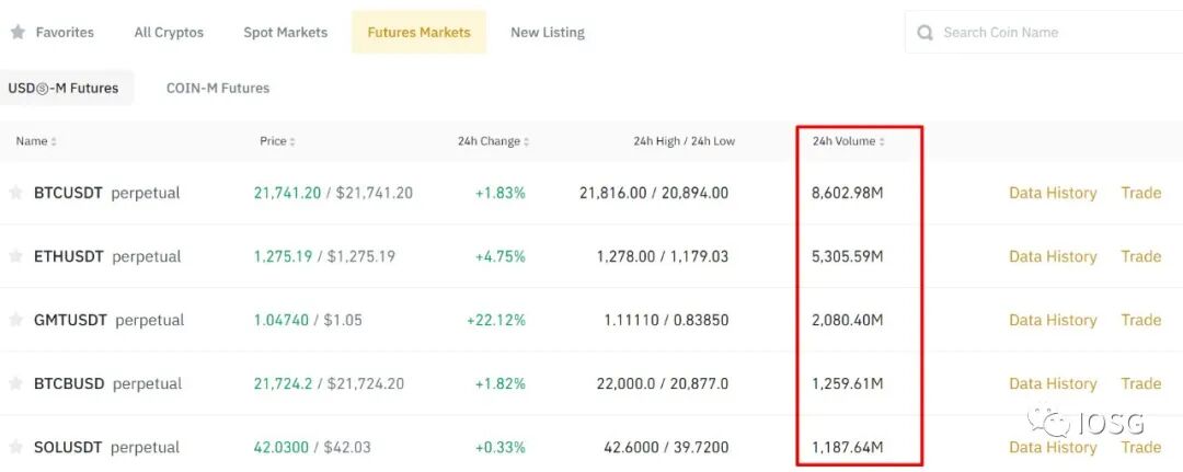 以最大的中心化交易所Binance为例,其衍生品的交易量远超于其现货交易量。(取2022.6.26的数据,以BTC/USDT为例,其合约交易量大约为现货交易量的8倍)