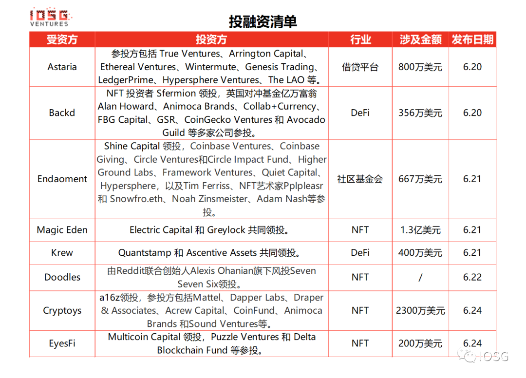 NFT 借贷平台和流动性引擎 Astaria 完成 800 万美元种子轮融资,参投方包括 True Ventures、Arrington Capital、Ethereal Ventures、Wintermute、Genesis Trading、LedgerPrime、Hypersphere Ventures、The LAO 等。Astaria 创始人为前 SushiSwap 首席技术官 Joseph Delong,该协议支持用户通过抵押 NFT 进行以太坊借贷。Astaria 创始人兼首席执行官 Justin Bram 表示,本轮融资将用于扩大其目前的八人团队。该平台最早将在今年 9 月推出。* DeFi