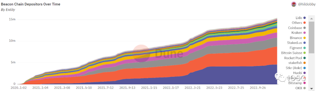 如果中心化交易所在ETH质押市场上占主导地位,那将违背以太坊建设去中心化网络的目标。如下图所示,Lido是ETH质押领域的头部项目,占据了大约30%的市场份额。