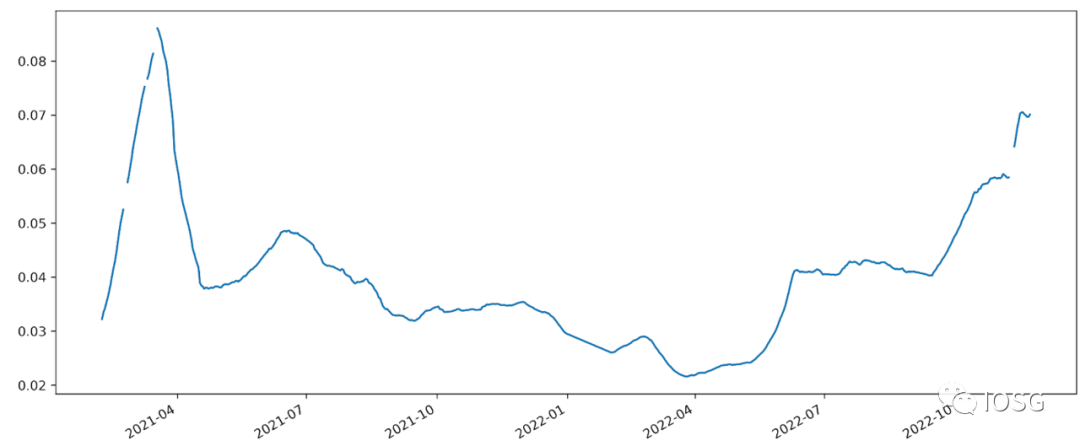 使用来自 https://ultrasound.money/ 的数据点,我们估计 TVL 增加 1%,基础奖励 APY 减少了 0.41%。
