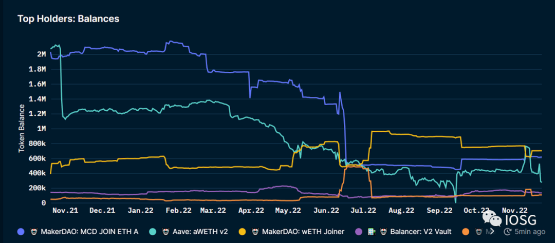 下图表明,一些最大的 DeFi 协议不支持 stETH 标准,这就是为什么我们可以看到 Wrap 的 stETH 被用于 MakerDAO、Balancer、Euler 等。尽管 Wrap 和 Unwrap 不是一个重大障碍,但它确实会影响用户体验。