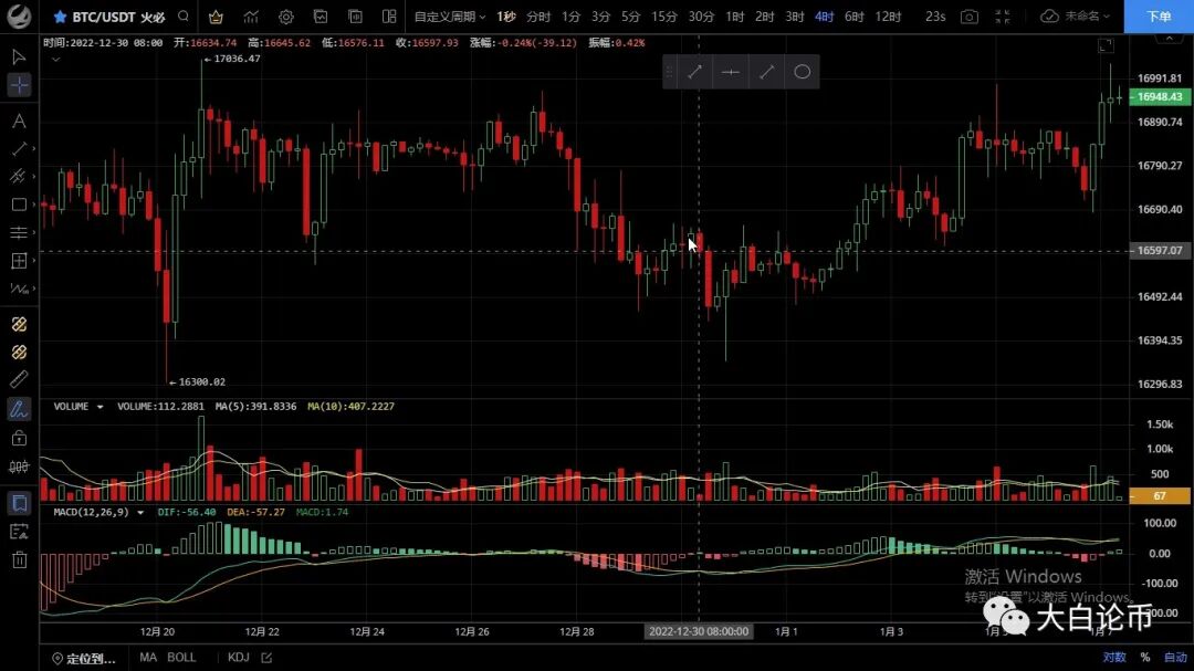 大饼昨日整体呈下行,走势较为缓慢,晚间行情跌至16680附近,非农数据公布后行情一路上行,凌晨突破17000关口,恭喜跟上昨日思路的朋友多单获利300点,目前币价在16950附近运行,小时级别来看行情未能站稳17000迅速下跌,但回踩力度不大,且没有延续性,ma7向上指引回踩没有破位,目前来看行情处于高位震荡整理,四小时级别k线连阳突破ma90压制,但上方阻力较强行情未破前高收长上影,macd没有明显上涨趋势,短期多头滞涨,日内关注能否突破站稳17000,若站稳后市还是上涨的空间,思路上则回踩做多,上方压制17000-17400,下方支撑16700-16300