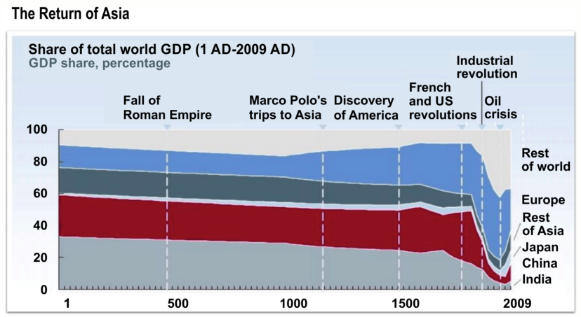 直到最近,印度和中国占了世界 GDP 的 50% 至 60%。直到 16 世纪,西欧人(随后是美国人)才开始取代他们主要是亚洲的竞争对手,并创造了可敬的帝国,如大英帝国和美洲帝国。