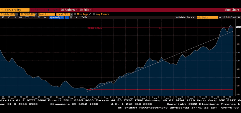 上图显示了 SPY/EEM ETF 的比例。正如你所看到的,在过去十年里,美国股市的表现比新兴市场高出近 300%。过去十年是金融化、印钞票的高峰期,也是发达市场通货膨胀的低谷期。这种组合在未来几十年内不会再出现。