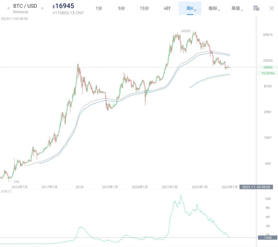 比特币今日来看,行情 走的比较平淡,在这个位置已经横盘了一天时间,不过值得一提的是,大周期上来看现货市场的波动率已经创下新低,到达2020年前的位置,大家可以看一下我这张周线图,也就是说到达了上一轮熊市的底部区域附近左右,上一轮熊市的底部波动率大概维持在600左右震荡,而比特币现在的波动率正处于1400附近,不要看还有一倍多的距离,按照这个下行速度来看,要不了几个星期就能冲下去,随后做一个相对比较漫长的低波动率盘底走势后,才能做好爆发下一轮牛市的准备,因此从这些方面出发来看,当前的比特币时间点对标上一轮熊市的时间线来看,个人觉得23年大概会类似于等于2018年9月开始至2019年底,所以今年必定会有很多机会和风险并存。另外短线上来看这两天相关山寨币还在一点点爆发,侧面则可以看出来比特币和以太坊暂时还算安全,因为如果比特币和以太坊要崩,那么山寨币早就提前一副死样子了,不可能会选择在比特币以太坊要跌的时候还在拉盘,本来熊市资金就不多,资金压力很大,大多庄家都是顺势而为很少打逆风仗,继续观察一下17000和以太坊1300阻力位能否突破吧,如果出现龙头山寨币也有机会反向带动以太坊涨,以太坊再带动比特币涨也行,观察看看。