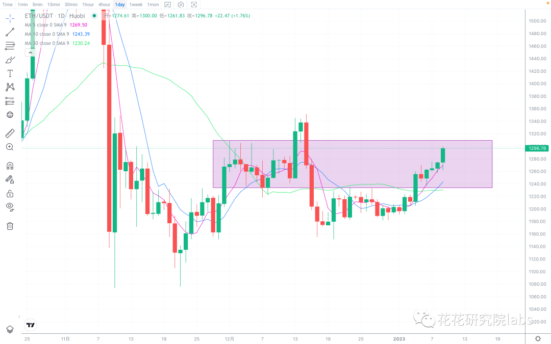 以太坊来到了花哥说的箱体上沿,也是接近前高附近的压力,这个位置不太建议追涨了,可以尝试前高附近做空,突破前高止损。