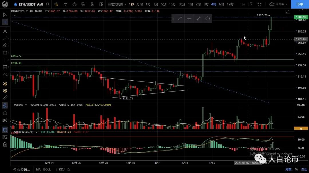 以太坊昨日白盘同样波动较小,上下不到10点空间震荡,下方试探1260有效支撑未破,随后行情一路反弹上行,最高触及1312一线,恭喜跟上昨日思路的朋友,昨日文中提及会上摸一次1310附近行情如期到达,小时级别行情沿ma7一路上行,均线向上指引,macd多头逐步放量双线金叉状态,目前行情偏向多头,但上方临近压力不可盲目追多,短期先看回踩,四小时级别未能有效突破斐波那契38.2的位置,有机会形成双顶回落,目前走势虽偏向多头,但仅是反弹,上方1350不破还是会回踩,日内思路建议先短空然后关注回踩力度再进多,上方压制1310-1350,下方支撑1290-1275