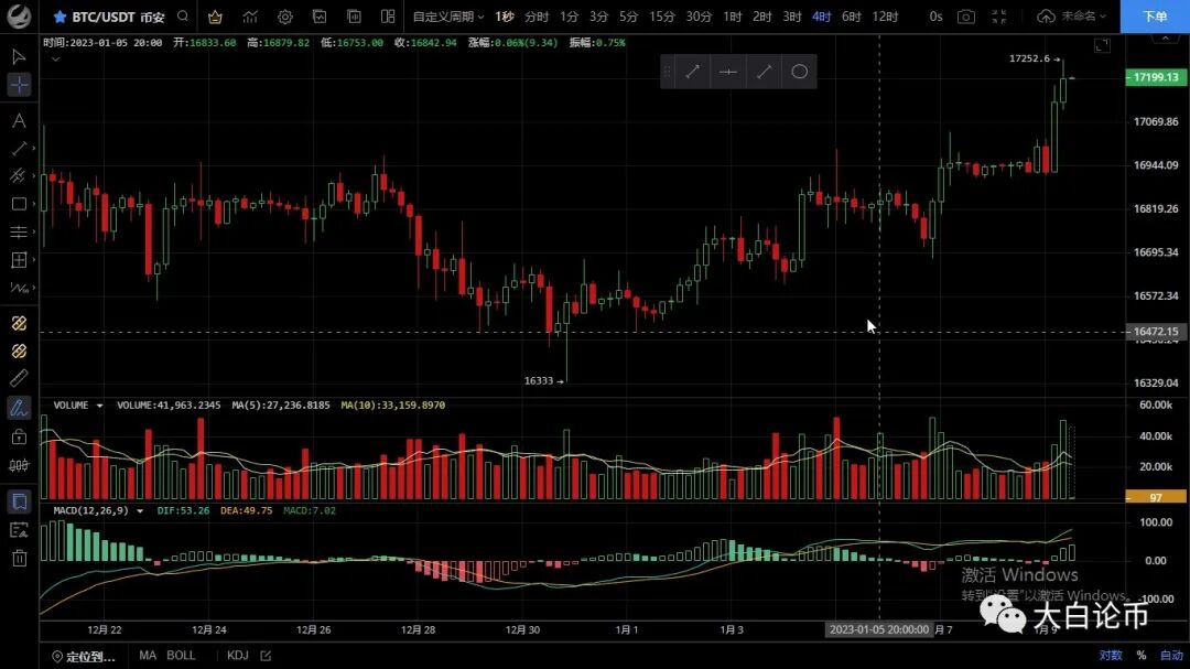 大饼周末两天波动不大,昨日多次试探16900都未跌破,凌晨突破17000后迅速下跌,直到早间开盘多头发力向上拉升最高触及17240附近承压回落,恭喜跟上近期思路的朋友,目前币价在17200附近运行,小时级别来看多头逐步放量双线金叉向上延伸,行情经过这两天的震荡终于突破17000关口,短期多头暂时滞涨有回落需求,四小时级别k线连阳拉升多头走势偏强,ma均线向上指引,若日内能站稳17000上方后续还有上行空间,目前临近压力短期不建议追高,日内思路建议回踩做多为主高空为辅,上方压制17400-17800,下方支撑16900-16700