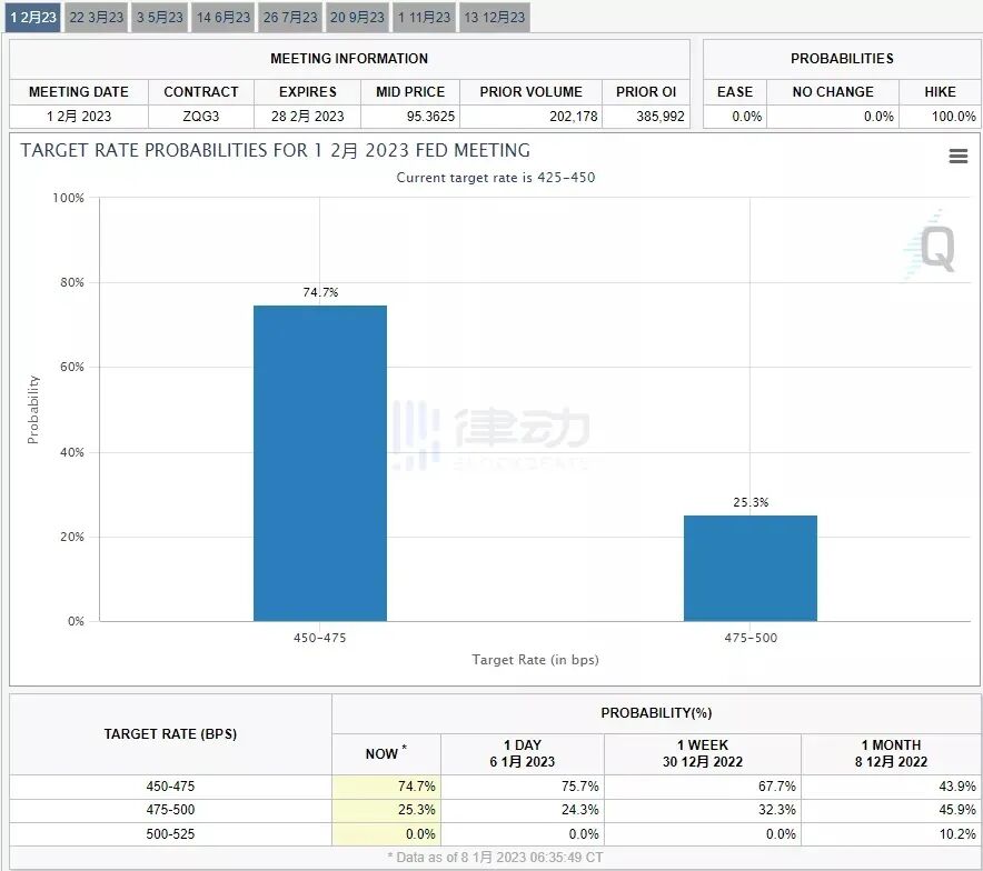 因为新的会议纪要非常的鸽派,很多美联储官员对投资者无视经济风险过于乐观并且不停的炒作美股的现状表达不满,所以目前市场对于2月的加息有些十分激进的预期,据CME「美联储观察」报告,美联储 2 月加息 50 个基点至 4.5%-4.75% 的概率为 74.7%,加完以后利率就已经向5靠近,这是非常危险的经济衰退的信号。2023 年 1 月 31 日至 2 月 1 日,美联储将召开议息会议并公布决议声明,也就是我们过完春节后。