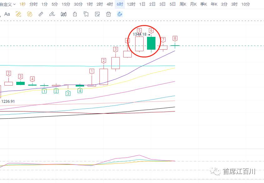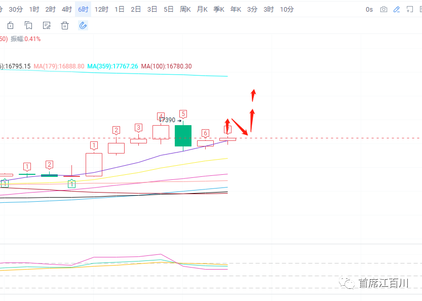 要操作的话,基于上述思路,那么最好是等日线回踩均线做T字线的时候做最好,止损16900跌破问题就不大。要想更加精确或者更加激进,防止市场直接反包上去,那么就可以参考6小时线来做,因为这个级别形态是典型的并列线,并列线的玩法就非常清晰: