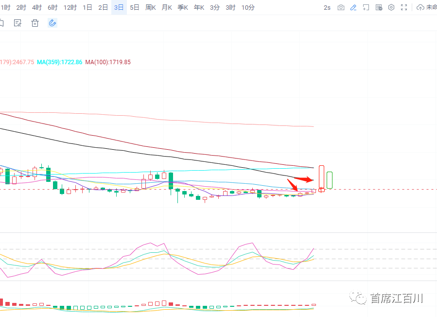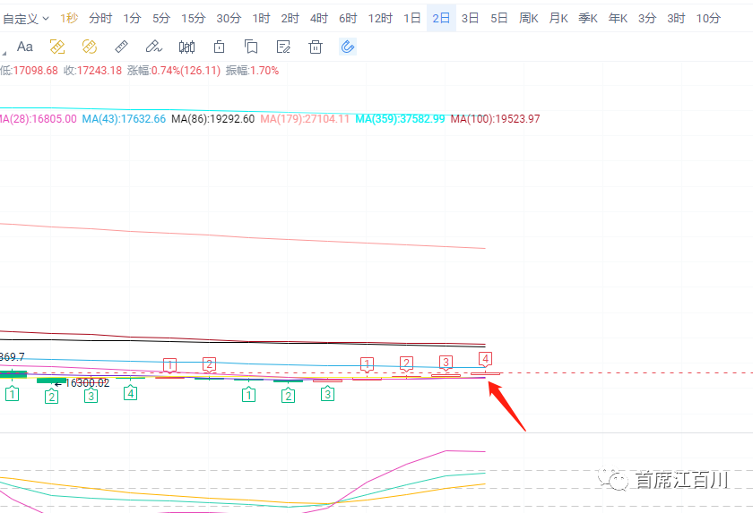 上图可以看到2日线目前处于短均线和中期均线之间,上下都有一定距离,而明天早上8点就收线了,所以这种形态要么用更大的涨幅吸引下方短均线上翘支撑价格,要么就适当的回落震荡等待一下短均线,让价格和均线偏离不太远。所以从2日线来说是震荡和继续反弹两可之间的,都是强势形态。