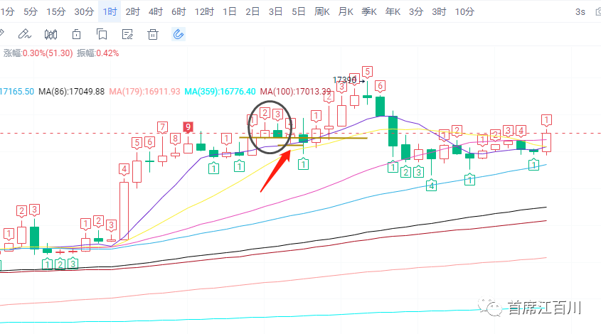 如果要进行回踩,那么16900支撑应该是无恙的,最多到17050以内就会受到短均线的支撑然后形成和昨天倒锤头线互为镜像的下影T,这就会形成揉搓线,那么明天相对大的阳线就可以出来,这也就是今天剩下时间震荡的可能性。另一种情况则是今天就进行继续的上行,毕竟昨天上影线虽然长但昨天低点还没破,是可以直接阳线实体吞没上影线的,因此哪怕日线来说也没法得出精确的一定涨或者震荡的结论