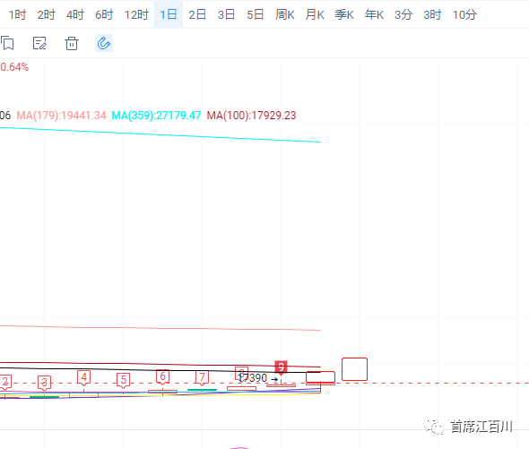 大饼是阴包阳,并不标准,目前形态可以如上图所示,不破阴线低点然后继续上行,所以如果是这种,日线就是吞没昨天上影线,以阴线低点17135美金跌破为止损就可以。如果跌破了就说明转震荡玩法概率高,操作是合理的。
