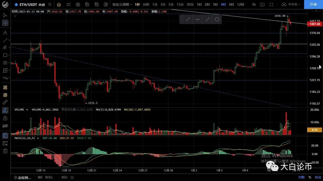 以太坊昨日走势和大饼一致,晚间行情再次下跌破位前低走出回踩后冲高,最高触及1436一线形成顶背离结构走出一波回踩,恭喜跟上近期看多思路的朋友,一路做多收获不少,小时级别行情承压后回踩至ma30支撑未破,目前连阳上行关注能否突破趋势线压制,macd空头运行双线死叉向下,ma7均线拐头向下指引,技术指标来看行情偏向空头,四小时级别整体结构明显呈震荡冲高回落走势,上方1440无法突破,多头力度减弱逐步缩量,行情连阴回落,日内关注能否站稳1400上方,近期多头走势较强有机会去试探1460重要阻力位置,1350破位则继续看空,思路建议关注回踩力度逢低做多为主高空为辅,上方压制1430-1460,下方支撑1400-1370