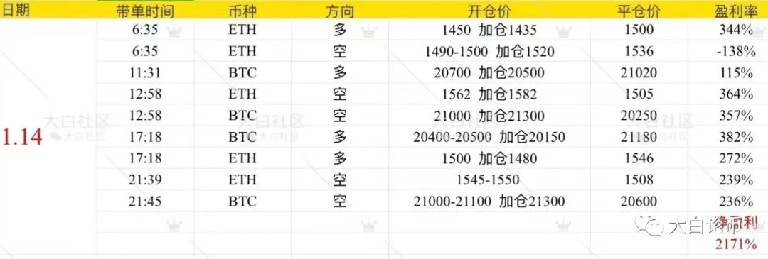 下方是大白社区本周实盘群单子,恭喜跟上的币友,如果你操作不顺,可以来试试水。