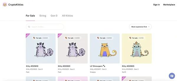 CryptoKitties 是 Dapper Labs 于 2017 年 11 月 23 日推出的一个基于 NFT 的区块链游戏。它被公认为是 NFT 行业的先驱,在 2017 年获得了巨大的人气,并以大量的猫咪繁殖、买卖和交易量几乎堵塞了以太坊网络。尽管面临来自其他游戏的竞争,但 CryptoKitties 仍然流行了很长一段时间,至今仍广为人知。除了创新之外,CryptoKitties 的内置市场还以其用户友好的界面和外观而著称,具有排序、类别等功能,已被许多其他 NFT 市场效仿。CryptoKitties 目前可以在 CryptoKitties 的内置市场和 Opensea 上购买。