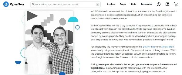 Opensea 是一个综合 NFT 市场,于 2017 年 12 月推出,是已知第一个汇聚了来自多个项目的 NFT 的市场。它在推出几个月后就上架了 30 多个不同项目的 NFT。在当时,大多数 NFT 项目都是 ERC-20 代币的混合体,直到 2018 年 3 月才出现了第一个 ERC-721 完全标准化的项目 Su Squares。直到后来,OpenSea 才将自己确立为符合 ERC-721 的市场。自推出以来的五年里,OpenSea 已成为以太坊上的领先 NFT 市场,并已扩展到其他区块链上,如 Solana、 Polygon、 Binance Smart Chain、 Avalanche。