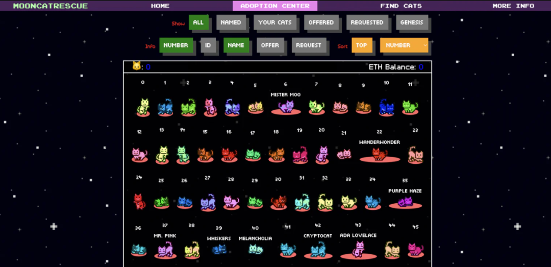 MoonCatRescue 是最早的生成式 NFT 项目之一,由 Ponderware 于 2017 年推出。它允许用户随机生成超过 40 亿种的猫的图案。MoonCatRescue 的市场功能类似于 CryptoPunks ,投标人需要将 ETH 存入市场合约才能对 MoonCat 进行报价。猫主可以通过“请求”功能出售他们的猫,接受出价。目前可以在 OpenSea 上购买驯化的 MoonCats。